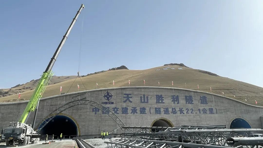 9月9日,天山胜利隧道出口端首榀钢桁架在130吨级轮式起重机的精准操控下稳稳落位,标志着世界最长高速公路隧道正式启动洞口遮阳棚施工。这一关键节点正式为项目收尾按下“加速键”。