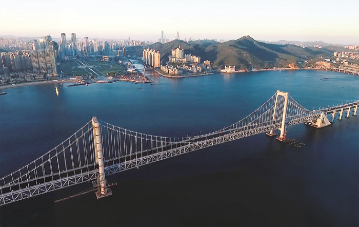 辽宁大连市星海湾大桥主桥为(180+460+180)米跨径的双塔三跨悬索桥,上下双层八车道,是国内首座海中地锚式悬索桥,也是我国第一座双层通车的钢桁梁悬索桥。