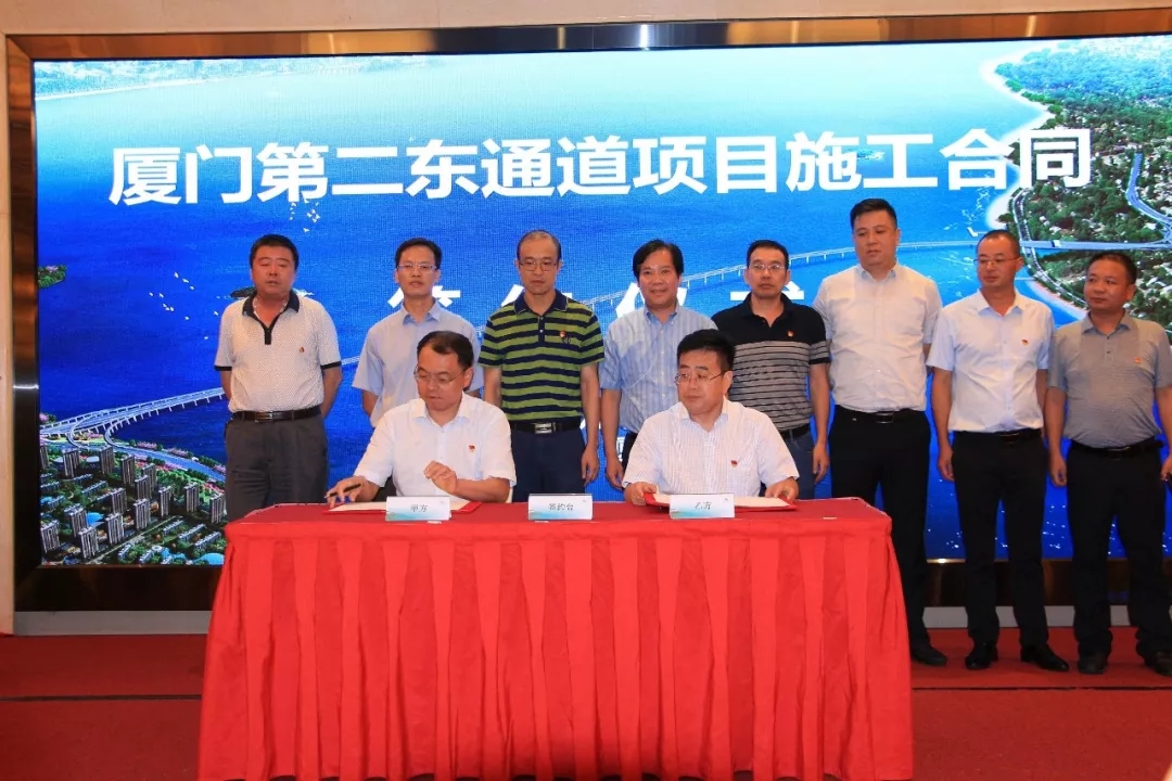 8月28日,厦门第二东通道工程施工承包合同(A1-A4标)签约仪式在厦门市举行,厦门市交通运输局规划建设处处长谢子山,厦门路桥建设集团党委书记、董事长林小雄,总经理吴灿东,中国交建海西区域总部总经理齐文忠,局党委书记、董事长赵桢远,局总工程师、副总经理欧阳效勇,局海西区域中心、一公司、厦门第二东通道A1标项目相关负责人出席签约仪式。