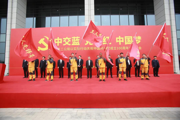 大会现场,局领导为党员先锋队、工人先锋号、青年突击队代表授旗。六公司党委书记、董事长郑俞,东萌公司绿博园项目经理李小羊,三公司西安地铁10号线项目党支部书记陈利平,五公司灞河岸线项目经理金永飞,三公司深惠城际大鹏支线工程土建一工区常务副经理周佳,分别作为所属单位党委书记代表、项目经理代表、党支部书记代表、党员代表、优秀青年代表作表态发言,表示要不忘初心、牢记使命,立足岗位、锐意进取,以实际行动和优异成绩庆祝建党100周年。