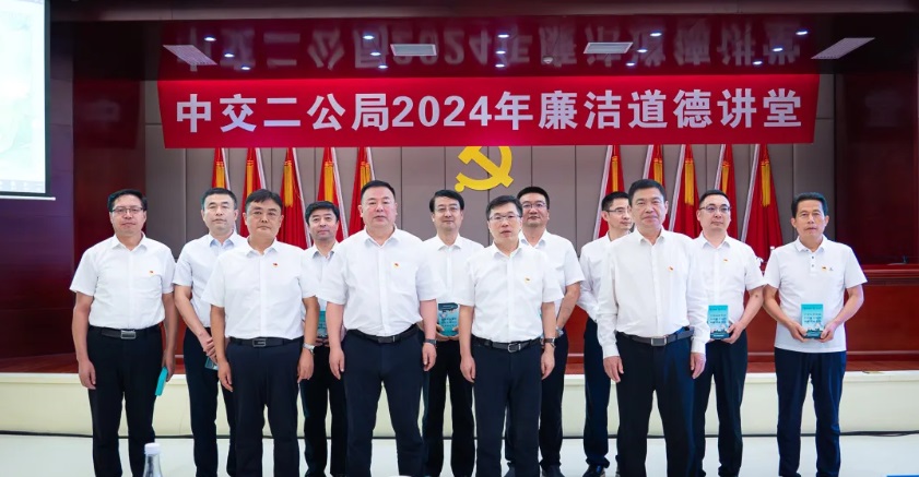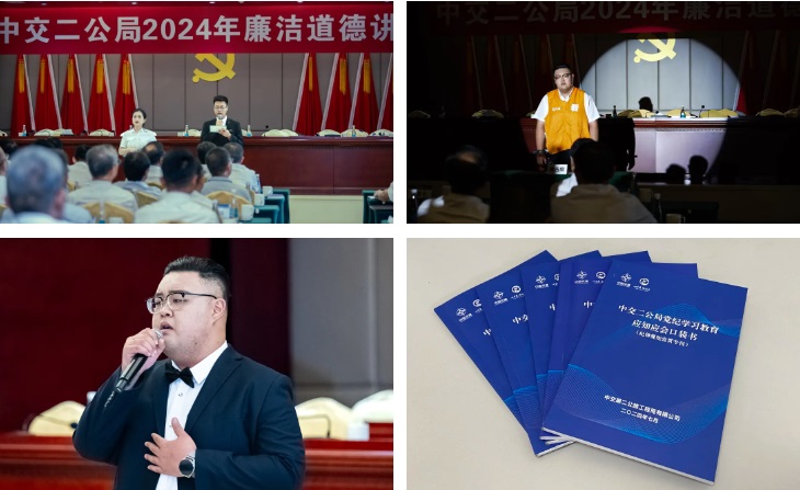 本次活动以“严守纪律规矩、弘扬新风正气、凝聚发展合力”为主题,共设听廉曲、诵经典、学模范、知敬畏、品廉剧、温准则、送廉礼七个环节。活动中,来自基层项目的员工演唱了廉洁歌曲《清风颂》,主持人深情朗诵了经典语录,并由讲述人分享了清廉模范的勤政事迹及其优良家风的故事。此外,全体与会人员还共同欣赏了廉洁短剧《路》和《台上台下》,并重温了《中国共产党廉洁自律准则》的内容。活动最后,局党委向员工代表发放了《中交二公局党纪学习教育应知应会口袋书》,并向每位参与者赠送了一份精美的“心至廉 路致远”主题书签作为纪念。