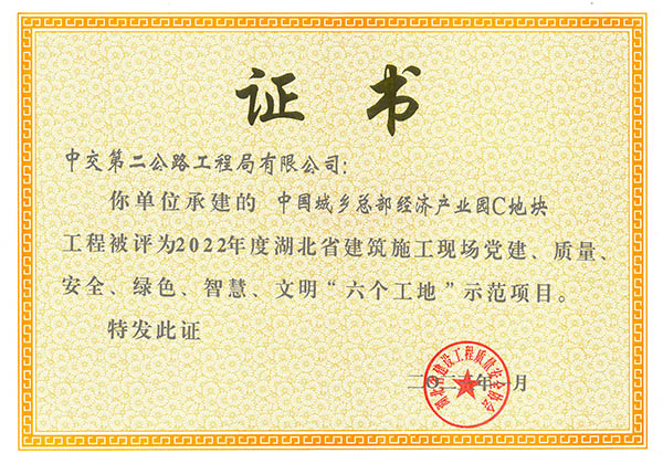 近日,中国城乡总部经济产业园C地块工程被评为2022年度湖北省建筑施工现场党建、质量、安全、绿色、智慧、文明“六个工地”示范项目。