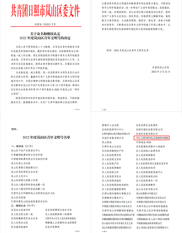 3月21日,日照市岚山区2022年度“青年文明号”命名和继续认定名单揭晓,日照房建项目青年团队再摘“青年文明号”荣誉称号。