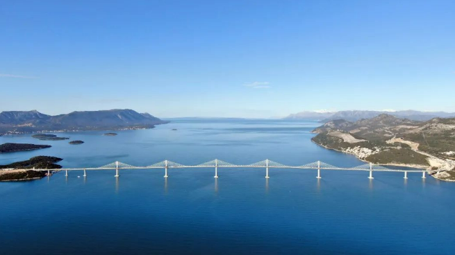 克罗地亚佩列沙茨跨海大桥全桥长2440米,宽22.5米,为6塔中央单索面矮塔斜拉桥。大桥是中克两国建交以来中国企业在克罗地亚承建的最大基础设施项目,也是中国、克罗地亚、欧盟开展三方市场合作的典范项目。大桥横跨亚得里亚海小斯通湾,连接隔海相望的佩列沙茨半岛,结束了克罗地亚南北部地区陆路通行要绕行波黑境内的历史,对促进该国经济社会发展具有重要意义。项目于2018年7月30日开工建设,2022年7月26日建成通车。