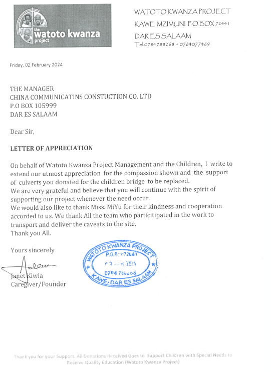 近日,坦桑尼亚分公司收到当地孤残儿童组织“首个儿童项目”(Watoto Kwanza Project)感谢信。信中,对分公司捐赠圆管涵帮助搭建“儿童桥”的善举表示感谢和赞扬。